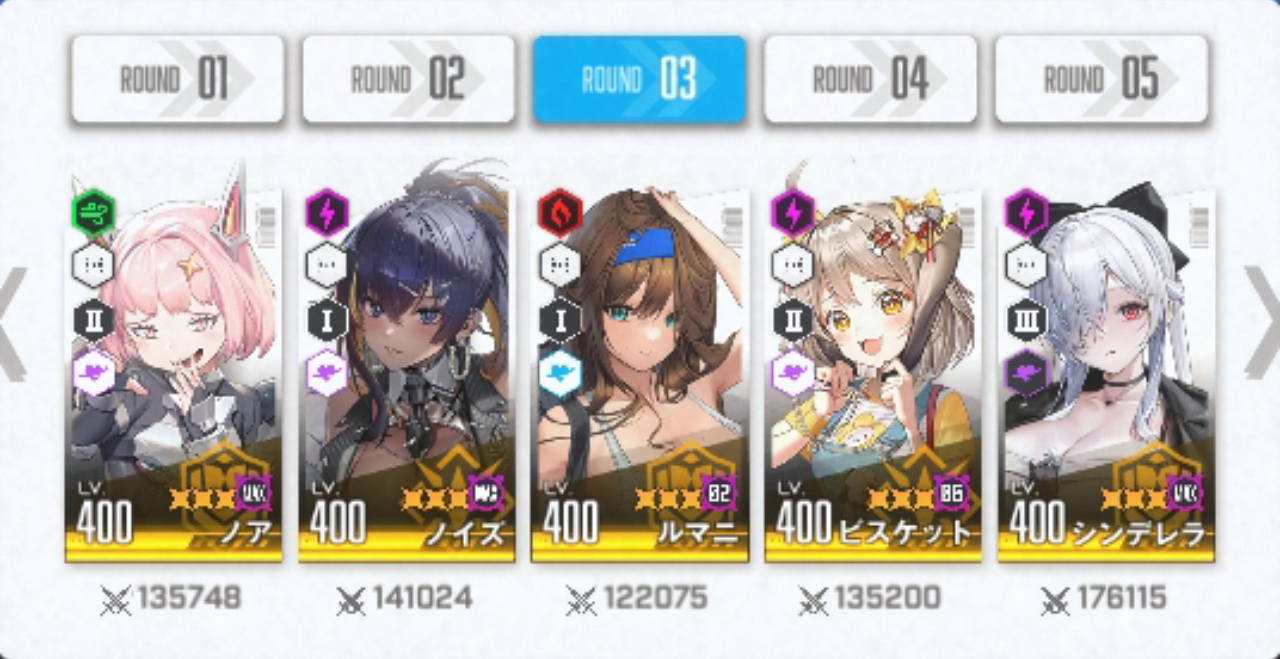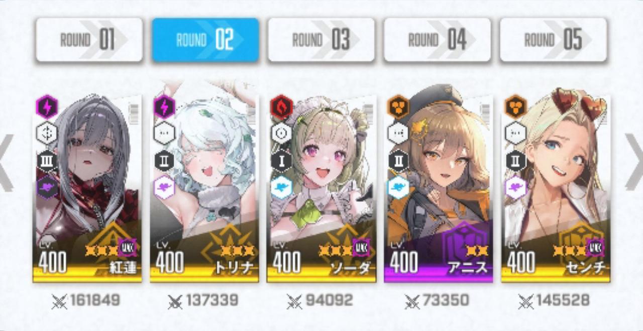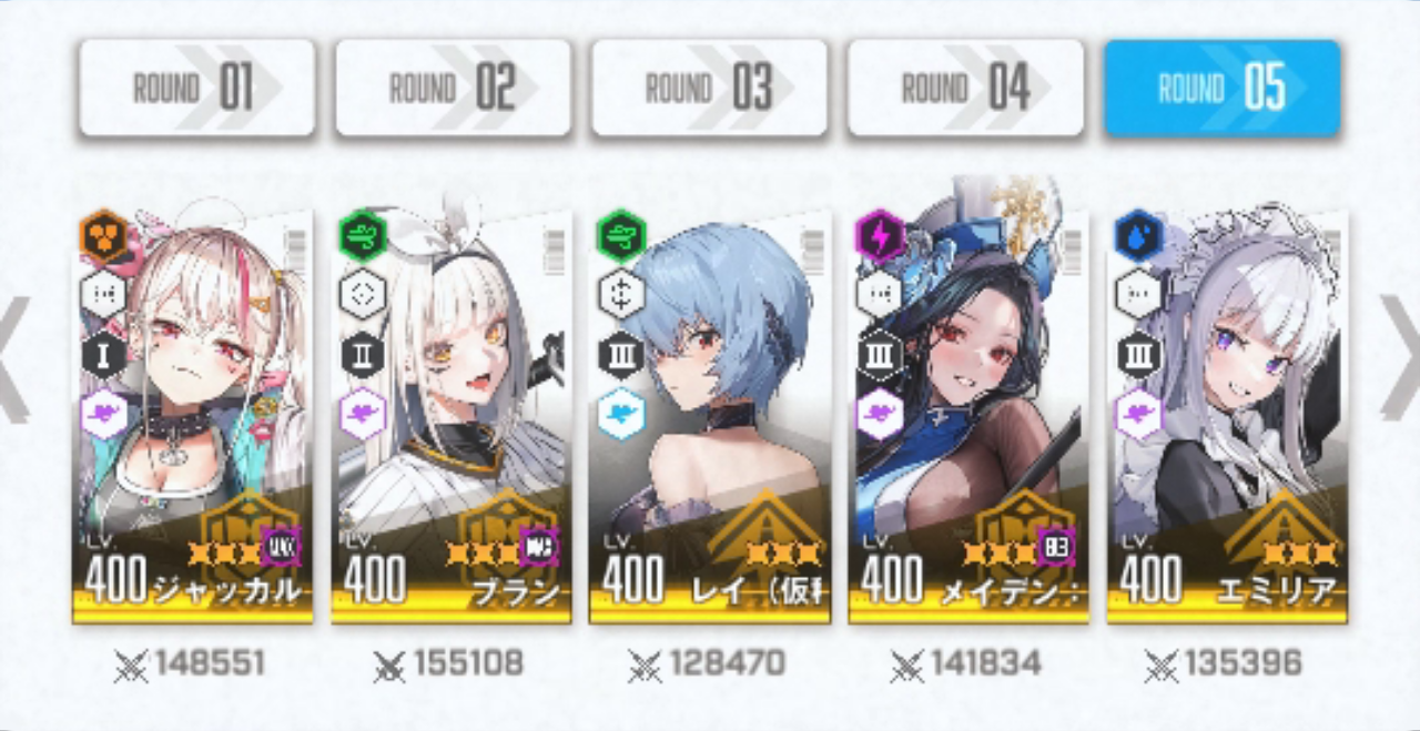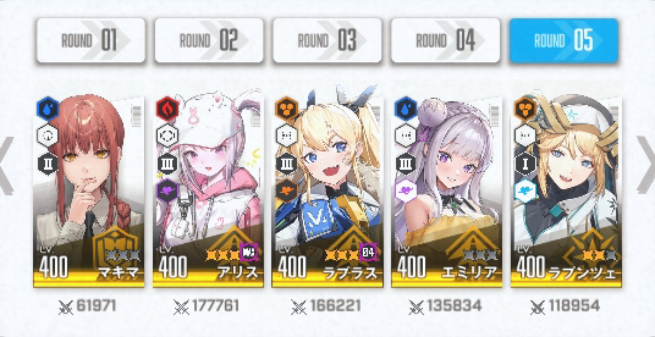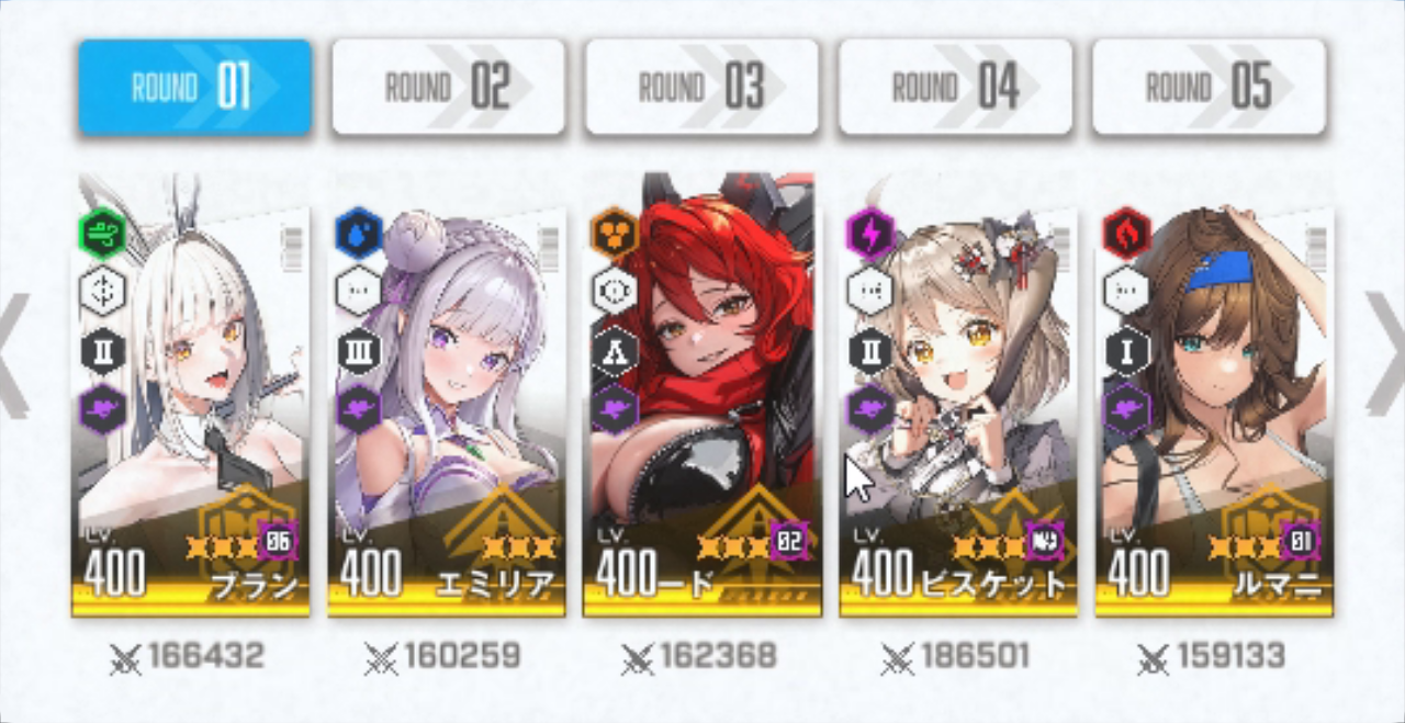 今まで私の部隊には装備未強化キャラが複数体いる状態で参加していましたが・・今回は装備を5段階まで(オバロ状態)強化出来ているキャラだけで参加しています。ただ・・一般的に普及している強編成はキャラを所持していなかったり、そのキャラが無凸未強化という理由で私は使っていません。