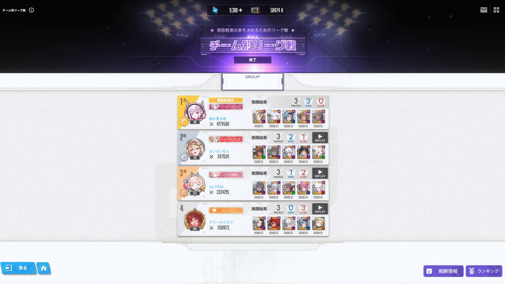 では「チーム別リーグ戦」の結果です。今回は総合戦力が「37万」ある人がいなかったので勝てました。