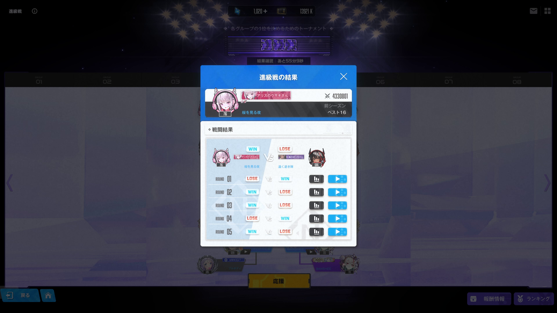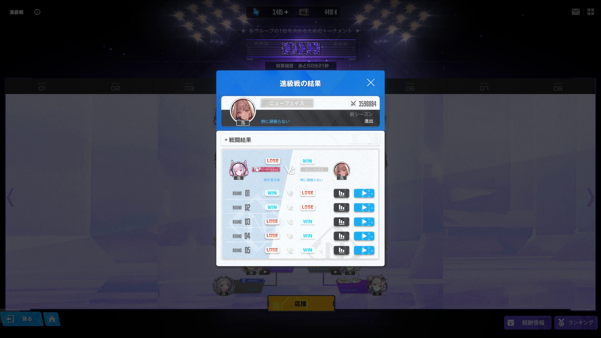 前回私を屠った「マナさん」は「第1グループ」にて健在です。もう一度戦ってもまた負けると思うので出来れば戦いたくありません。次戦を突破しちゃうと高い確率で「チャンピオン対抗戦」に出て来るでしょう。